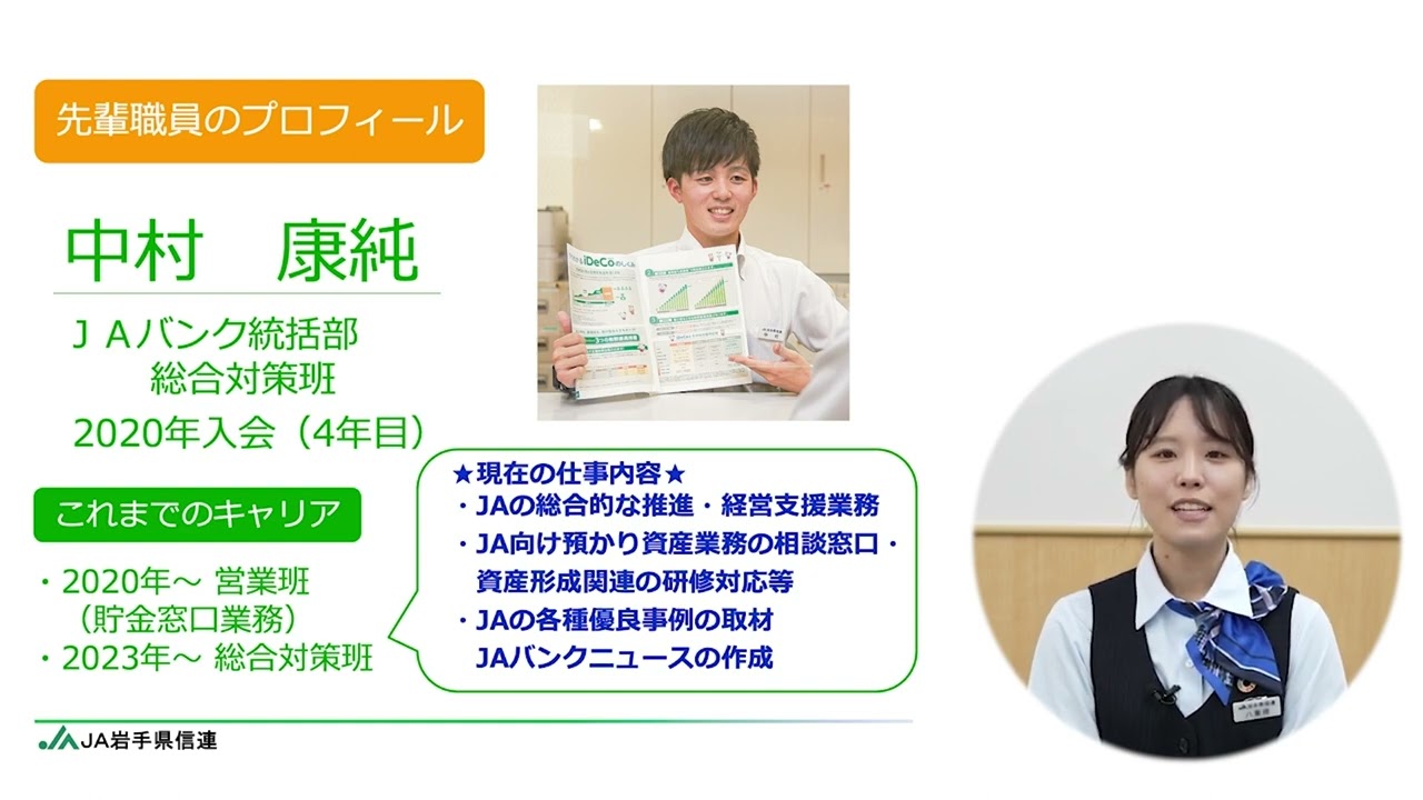 JAバンク岩手のホームページ更新に係る掲載調整や、TV・SNS・イベントでのJAバンク岩手のPRを担当しています。なかでも、CM出稿などのPR業務は、PRする内容に適した媒体や年齢の方に広告を届けられるように工夫しながら取り組んでいます。