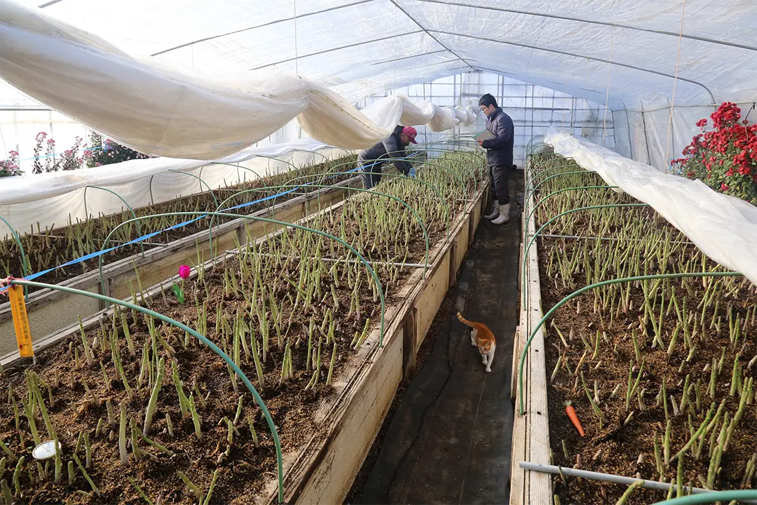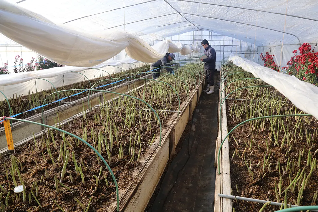 冬アスパラガスは畑で育てて寒さにあたってから株を掘り起こし、ハウスの中に伏せ込んで育てます。写真は、収穫が始まったハウス内の様子です。