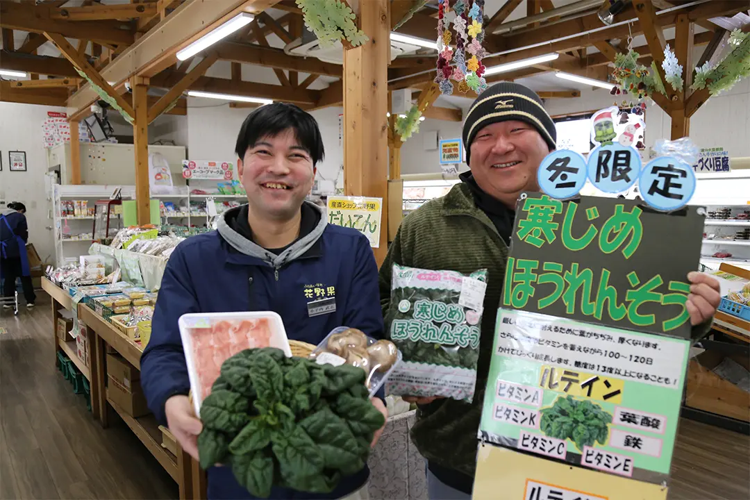 「寒じめほうれんそう」は久慈地域と八幡平地域で生産され、目の健康維持に効果があるとされる「ルテイン」を含む機能性表示食品として出荷しています。11月に糖度調査が行われ、糖度8度以上で「寒じめ宣言」となり出荷が始まります。今年度も11月下旬から出荷が始まり2月まで出荷が続きます。