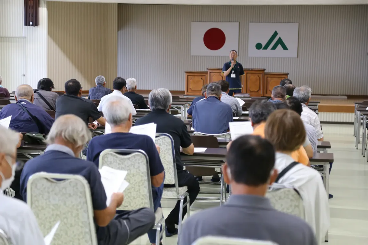 JA新いわて南部営農経済センターは9月5日、同センターで銀河のしずく刈り取り指導会を開いた。雫石町の生産者約150人が参加し、刈り取りの適期やポイントなどを確認した。