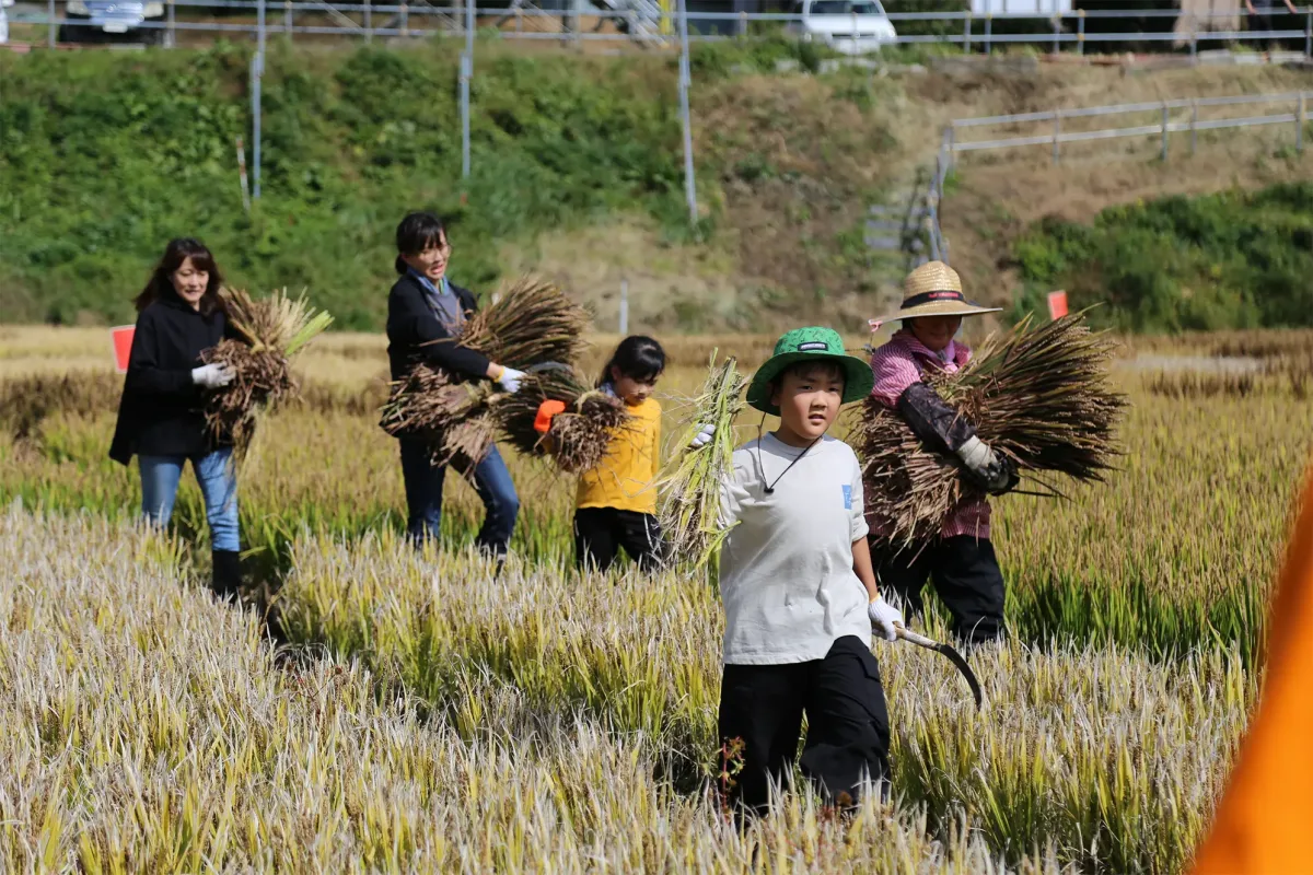 岩手町浮島地区で10月5日、6月に植えた田んぼアートの稲刈りが行なわれた。町内外から一般参加者約40人が参加し稲刈りを体験。参加者は6月に田植えも行ない、米作りへの理解を深めました。浮島地区営農組合やJA新いわて女性部岩手支部などが協力して、同町産の食材を使った昼食を準備した。