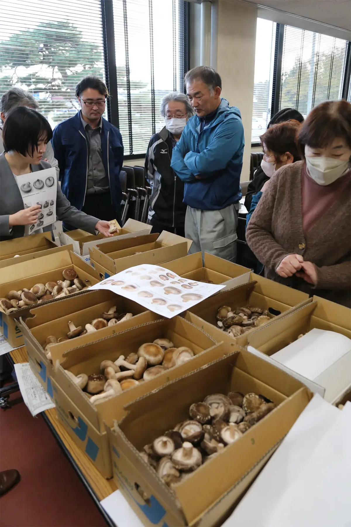 参加者は、かさの開きや水分の状態など、細かい規格を確認し、良品出荷に向けて意識を高めた。